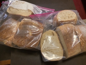 And so within a couple days of purchasing, I take my serrated bread knife and spend a few minutes slicing the loaves up into thick slices, put into a ziplock bag and then into the freezer.