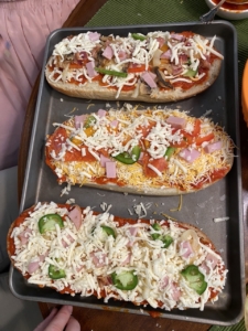 Those same French Breads from Costco work here. Very simple and fun.I cut them in half lengthwise. Muster up some jarred sauce, toppings and have some fun with the family assembling at the table.